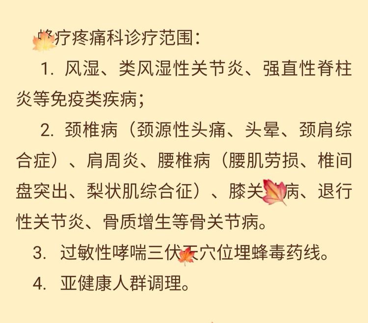 渭南市中医医院蜂疗疼痛科,是以风湿免疫和头颈肩腰腿痛为发展方向的重点特色科室;在开展蜂毒临床课题研究方面备受关注。科室主要开展特色疗法: