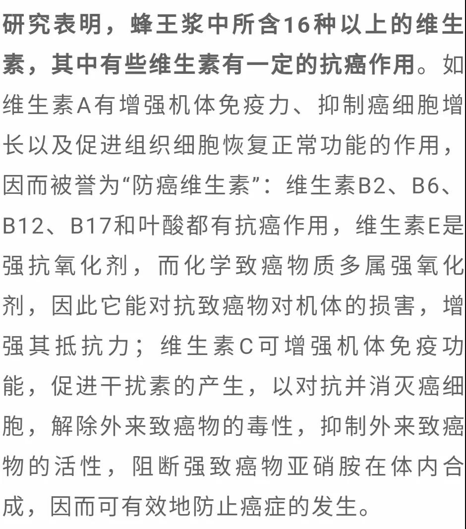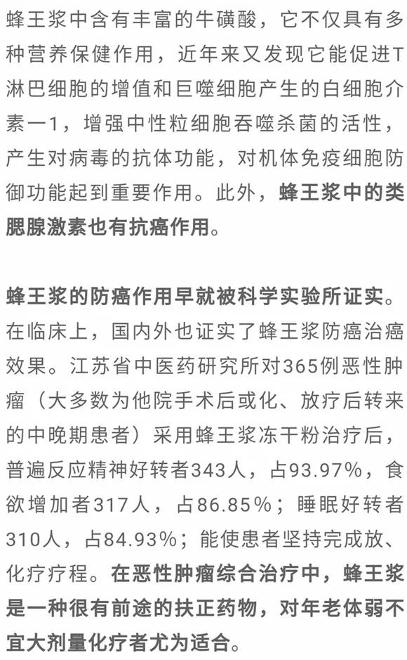 肿瘤是人体正常细胞异常突变的结果,根本原因是人体免疫功能失调,癌变的细胞逃脱了免疫监视,在体内迅速分裂增殖,形成恶性肿瘤。而服用蜂王浆能增强免疫功能,提高免疫力,无疑可收到良好的抗癌效果。蜂王浆对癌症患者有良好的治疗和辅助治疗作用,可明显延长生存期甚至康复。