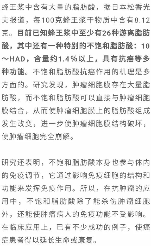 现代研究表明,恶性肿瘤的发病机理与治疗原理,都与核酸代谢有非常密切的关系。美国核酸营养学权威弗兰克博士在实验中发现,使用核酸的小白鼠,其自发性乳腺癌的发病率明显下降。经测定,每克蜂王浆中含核糖核酸3.9~4.8毫克,含脱氧核糖核酸201~223微克,因而有抗癌作用。