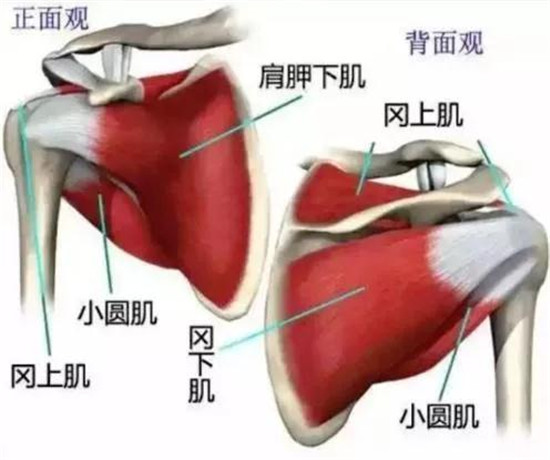 肩袖是由冈上肌、冈下肌、小圆肌、肩胛下肌的肌腱组成的,附着于肱骨大结节和肱骨解剖颈的边缘,其内面与关节囊紧密相连,外面为三角肌下滑囊。其环绕肱骨头的上端,可将肱骨头纳入关节盂内,使关节稳定,协助肩关节外展,且有旋转功能。这四块肌肉主要负责肩关节的运动。其中冈上肌主要负责外展,冈下肌主要负责外旋与内收及后伸,小圆肌主要负责外旋,肩胛下肌则主要负责内收与内旋,后伸。