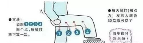 如图每天在大腿外侧的四个穴位点,用力敲打,每敲打四下算一次,每天敲左右大腿各五十次,也就是左右各两百下。