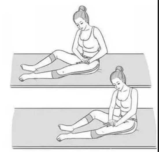 坐在床上,右腿向前伸直,左腿弯曲平放,双手交叠,压在大腿根部,沿着大腿内侧肝经的位置,稍用力向前推到膝关节的,反复推动,四五十遍,然后换另一只腿同样的手法。