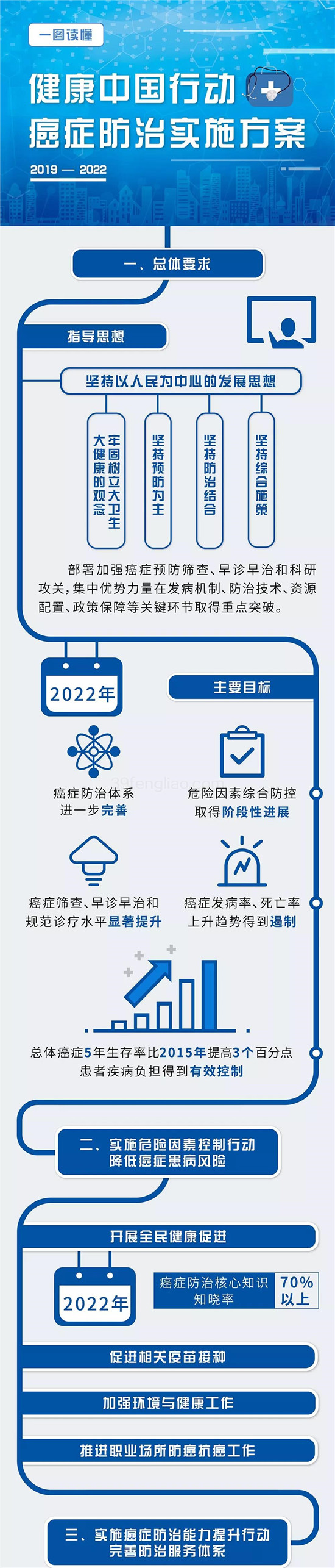 方案基于当前癌症防治现状和工作要求,明确到2022年癌症发病率、死亡率上升趋势得到遏制,总体癌症5年生存率比2015年提高3个百分点的总体目标。