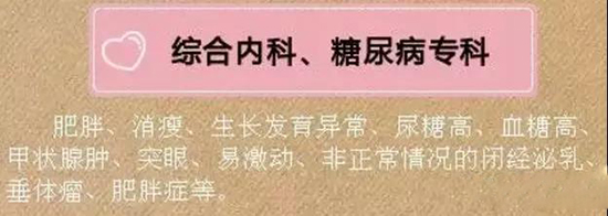 "综合内科"、“糖尿病专科”:原来咱内分泌代谢病专科现在是这个名字;也好,疑难杂症、“内分泌失调”、胖了瘦了、高了矮了、男的像女的(男不男)、女的像男的(女不女)都来吧,虽然就怕什么“内分泌失调”,我们是"综合内科"。