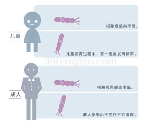 儿童在其生长发育过程中,有一定的自发清除率,大约10%左右;而成人HP感染,不经治疗,不可能自发清除。