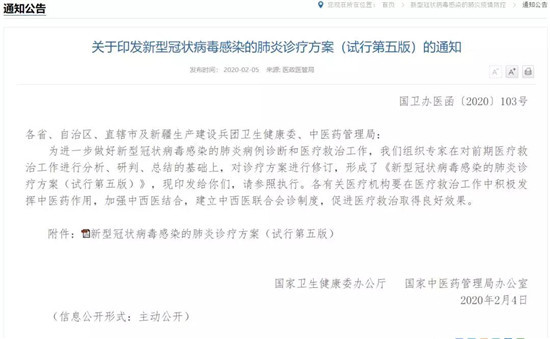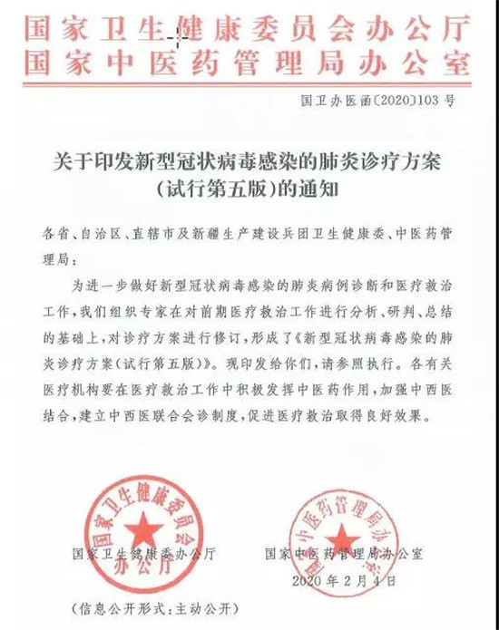 2月5日,国家卫生健康委员会办公厅和国家中医药管理局办公室联合印发《新型冠状病毒感染的肺炎诊疗方案(试行第五版)》