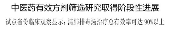 国家中医药局坚决贯彻落实习近平总书记重要指示精神,把人民群众生命安全和身体健康放在第一位,加速推进中医药防治新型冠状病毒感染的肺炎科研攻关工作。日前,由该局组织实施的应急科研专项已取得阶段性进展,据4省试点临床观察显示,清肺排毒汤治疗新型冠状病毒感染的肺炎患者总有效率可达90%以上。