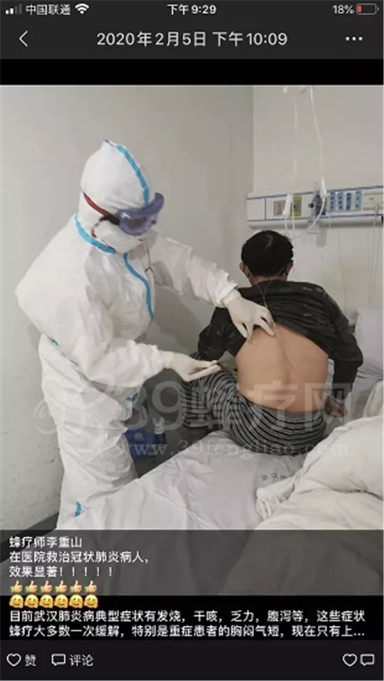 今天看到一段视频,战疫前线中医高手用蜂针治疗一女患者呼吸困难。前后2分多钟,2针后好转,再针3针,可以拨氧气管自行上厕所。令人振奋!