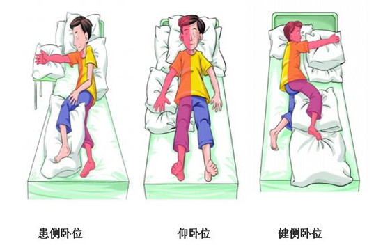 患侧上肢:患肩下垫一小枕,使与健肩同高,患侧上肢向外固定在枕头上,和躯干呈90度角或大于90度,肘、腕尽量伸直;手心向上,手指伸展、分开