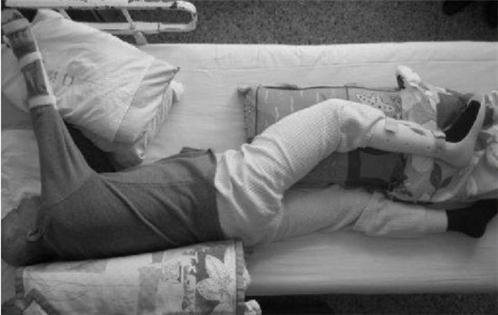 患侧下肢,骨盆旋前,髋关节呈自然半屈曲位,置于枕上。