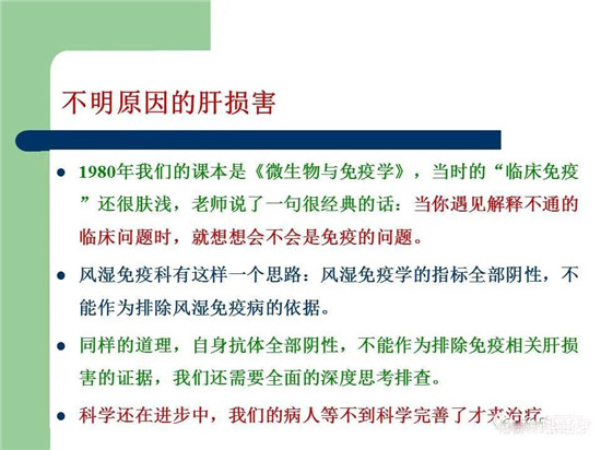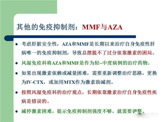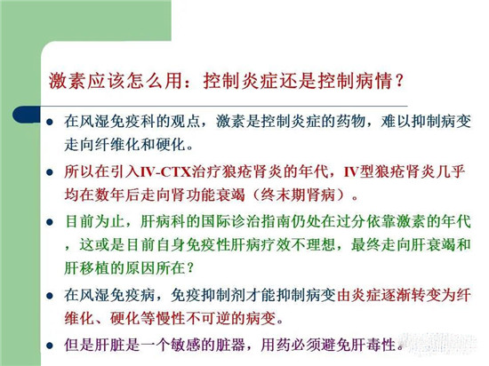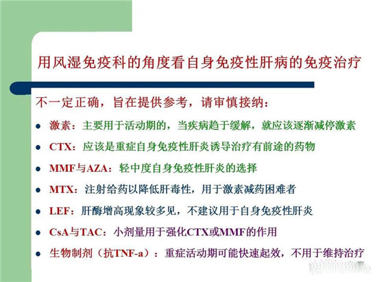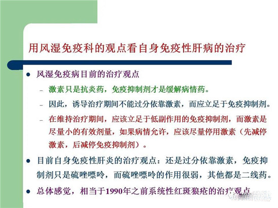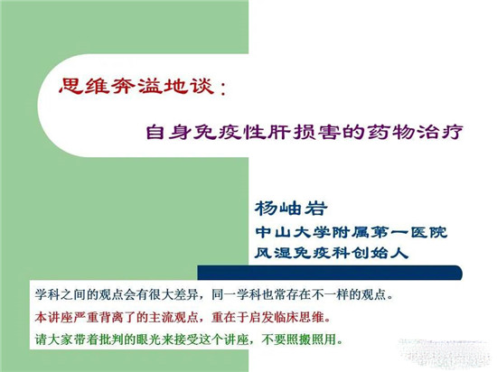 今晚围绕着这个思路,演讲的题目是《思维奔溢地谈:自身免疫性肝损害的药物治疗》,PPT放上来供风湿免疫科、肝病科、消化科医生参考和讨论。