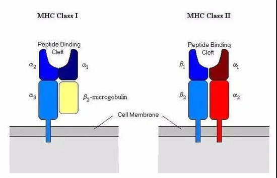 MHC-I和MHC-II在结构上有许多相似性,比如,它们都是由a和b双链组成。MHC-I中有3条a链,其中a1和a2形成结合信息密码的凹槽。MHC-II中ab均有跨膜区,a1和b1形成结合信息密码的凹槽。