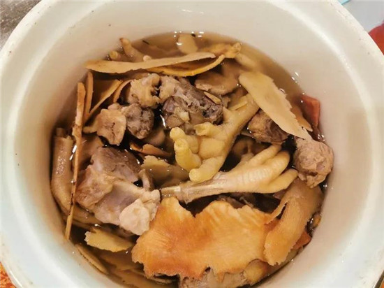 功效:汤中土茯苓性味甘淡平,入肝、肾经,有解毒除湿、清热止带、通利关节的作用。陈皮健脾理气、猪骨补虚填髓、鸡脚补虚增鲜。所以此汤有健脾清热、解毒利湿的功效。适于体内湿热困阻的人群:面部油脂多、痤疮、口粘口苦、大便粘着、外阴瘙痒、白带多、皮肤湿疹、身体困重、关节屈伸不利等。