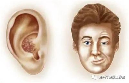 亨特综合征,又称为耳带状疱疹,约占面瘫的10%,由水痘-带状疱疹病毒感染面神经膝状神经节的神经核,且波及附近的听神经而发病。其主要临床表现为一侧耳部剧痛,耳部疱疹,同侧周围性面瘫,可伴有听力和平衡障碍。