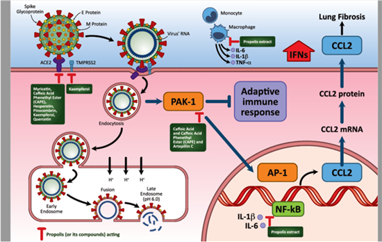 论文最后这张图总结出了蜂胶干扰SARS-CoV-2附着于宿主细胞、干扰病毒复制的主要途径。SARS-CoV-2进入靶细胞首先需要刺突蛋白与新型冠状病毒受体ACE2结合并被跨膜丝氨酸蛋白酶TMPRSS2激活。结合后,几个信号被触发,从而允许病毒内吞和PAK1(P21激活激酶1)激活,从而降低了宿主对病毒的适应性免疫应答和抗体的产生。PAK1还可刺激趋化因子CCL2的产生,引起纤维化反应。病毒感染会诱导核转移因子NF-κB激活,从而产生局部促炎性细胞因子。蜂胶中的一些活性成分可下调TMPRSS2和ACE2的表达,从而限制了病毒的进入。此外,蜂胶中的活性成分可促进NF-κB和单核细胞/巨噬细胞的免疫调节,减少促炎性细胞因子的过度产生,并且减少PAK1的活化,从而增加抗SARS-CoV-2抗体的产生。
