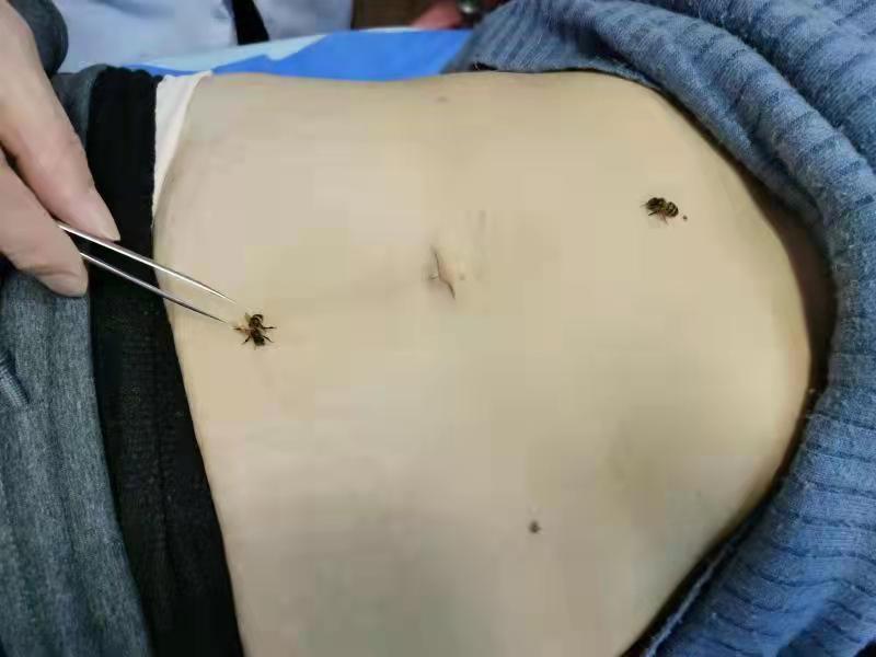 一位49岁的子宫腺肌症患者,辨证为脾肾阳虚,已是第4次来我科接受蜂疗,挂蜂针刺法后以蜂毒药蜡、辨证中药粉外敷腹部。尽管针刺过后总有些许瘙痒,但每次蜂疗后的舒畅感,都会成为继续治疗的动力和信心。