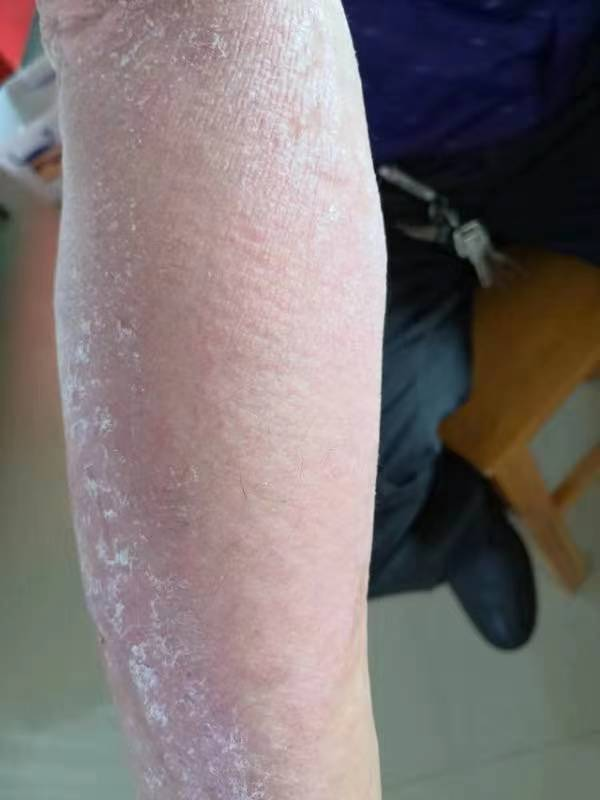 4、红皮型银屑病:表现为大于体表面积90%的皮肤弥漫性潮红、浸润肿胀伴有大量的糠状鳞屑。此病因常在治疗中外用刺激性较强或不适当的药物,或长期大量服用糖皮质激素突然停药或减药过快所致。
