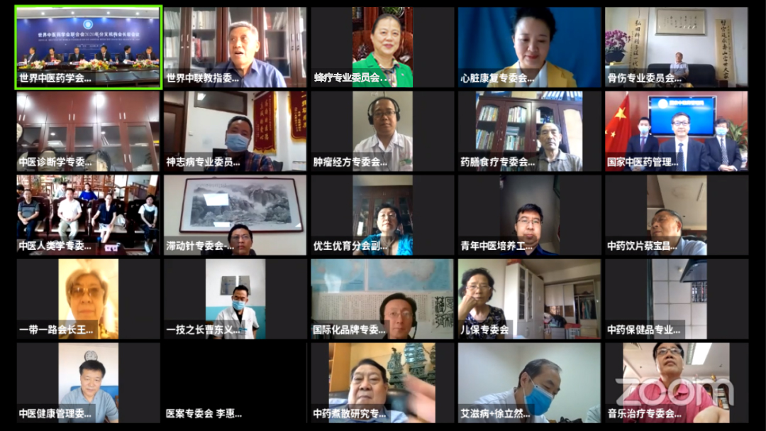 出席本次网络视频会议的有:国家中医药管理局科技司司长、科技发展委员会会长李昱,国家中医药管理局国际合作司吴振斗副司长,国家中医药管理局国际合作司朱海东副司长,中国工程院院士、国医大师、体质研究专委会会长王琦,中国工程院院士、澳门科技大学校长、中医药免疫专委会会长刘良,中国工程院院士印遇龙,湖南省中医药管理局局长、中医诊断学专委会会长黄惠勇,福建中医药大学校长、中医健康管理专委会会长李灿东,广东药科大学校长、代谢病专委会会长郭姣,广州医科大学校长、音乐疗法专委会会长王新华,长春中医药大学校长、满医专委会会长宋柏林,山东中医药大学校长、外治方法技术专委会会长高树中,河南中医药大学校长、仲景传承与创新专委会会长许二平,云南中医药大学党委书记、中医人类学专委会负责人王翠岗,南京中医药大学原党委书记、治未病专委会会长陈涤平,黑龙江中医药大学原校长、中药化学专委会会长匡海学,长春中医药大学原校长、中医手法会长王之虹,国家民委文化宣传司原副司长、一带一路标准与健康产业工作委员会会长王居,国家中医药管理局机关服务局原局长、亚健康专委会会长孙涛,以及世界中医药学会联合会秘书处和196个分支机构的会长、秘书长和分支机构筹建负责人近300人出席会议,近2000人在线观看会议直播。