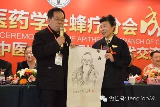 蜂疗分会成立大会现场,中国知名新闻人和画家、书法家王迈老师为王凤进队长赠送字画