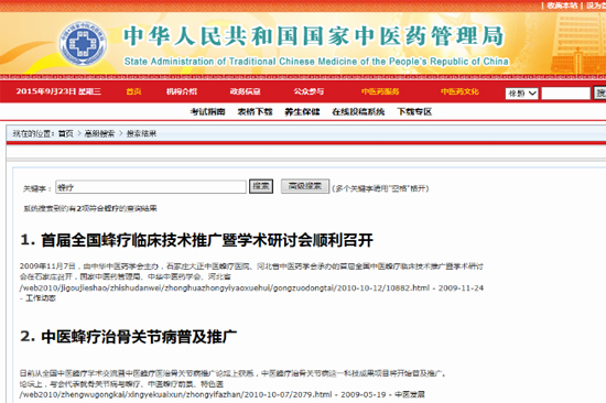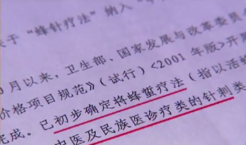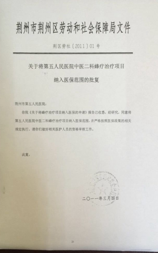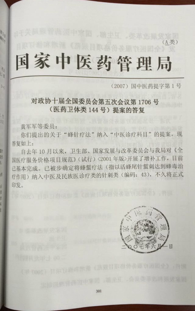2007年,国家发改委、国家卫生部、国家中药管理局三方联合下发文件,把“蜂蜇疗法“正式纳入“中医诊疗科目”。同时“中医蜂疗医治骨关节病”治疗方法,被正式列入“中国中医药科研开发交流中心科技成果推广项目”。“中医蜂疗人员”被确认为“一技之长医师”,可以纳入正规医疗队伍,具备从事“蜜蜂医疗”的从业资格。