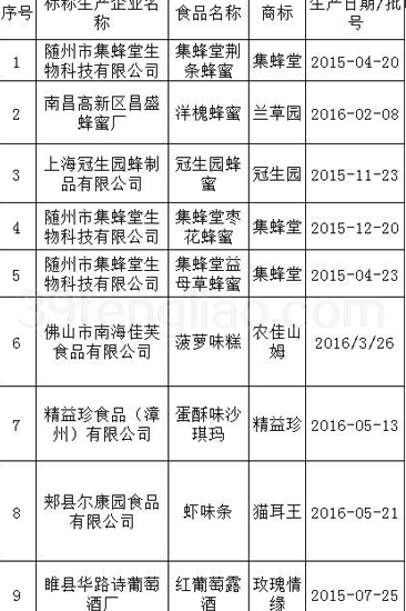 甘肃省食品药品监督管理局经过对全省范围内生产经营的43批次蜂产品、56批次糕点、54批次酒类进行监督抽检,其中不合格样品9批次。不合格产品名单。