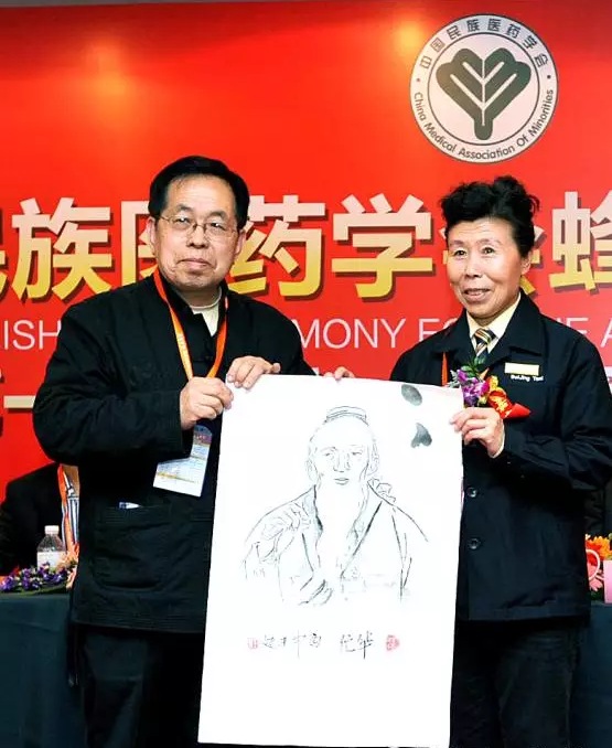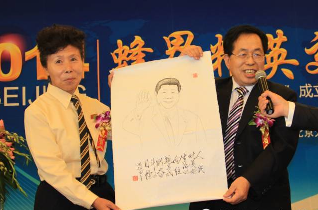 图:2016年中国民族医药学会蜂疗分会成立大会上王迈教授为中国蜂疗抗癌孝子曾伟赠送墨宝。