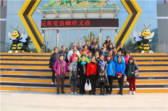中国国民党革命委员会党员们与蜂疗专家刘红老师在密云蜜蜂大世界正门合影