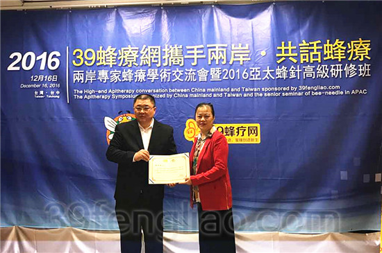 39蜂疗网总编荣任为亚太蜂针研究会荣誉会长,台湾亚太蜂针研究会刘国任会长现场为其颁发聘书。39蜂疗网总编发表致辞,对于“两岸共话蜂疗的传承”,他表示39蜂疗网是两岸同胞沟通交流的重要桥梁。“师出一脉”台湾蜂疗是祖国蜂疗技术的继承和发展,张总编现场表示39蜂疗网将为今后两岸专家共话蜂疗方面做出更多贡献