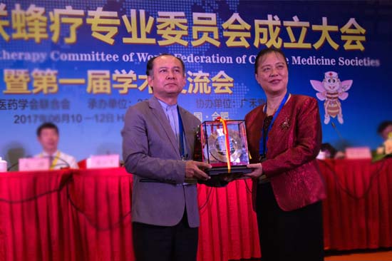 桑秘书长强调:近年来药源性疾病日益明显突出,中医药受到境内外医药界的重视和青睐, 特别是中医蜂疗这一天然疗法受到高度关注,蜂疗行业的发展迎来了新机遇;蜂疗专业委员会的成立,搭建了一个国际交流与合作的学术平台,表示要充分利用这个平台,抓住机遇,积极促进蜂疗技术深度研究与创新的传承发展和国际学术交流,不断加强世界中医药文化及学术交流的深度和广度,将中医蜂疗事业提升到新高度,开辟蜂疗领域中医应用的新天地,为人民健康作出更大的贡献。