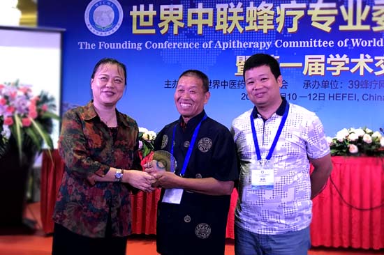 李万瑶会长为蜂疗成功抗癌7年的曾伟父亲,与会颁发”世界中联蜂疗专业委员会“纪念牌