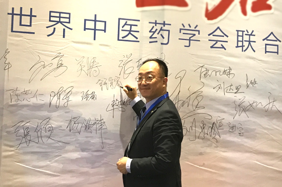 广禾堂钟宇富董事在世界中联蜂疗专业委员会成立大会现场签名