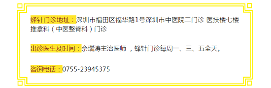 佘瑞涛主任 深圳市中医院推拿科主治医师,医学硕士,毕业于广州中医药大学针灸推拿学院。现任世界中医药联合会脊柱健康专业委员会第一届理事会理事、中国民族医药学会蜂疗分会常务理事、广东省中医药学会整脊专业委员会委员、深圳市中医药学会整脊专业委员会常务委员。