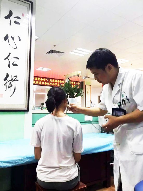 佘瑞涛主治医师在给强直性脊柱炎患者颈部施行蜂针