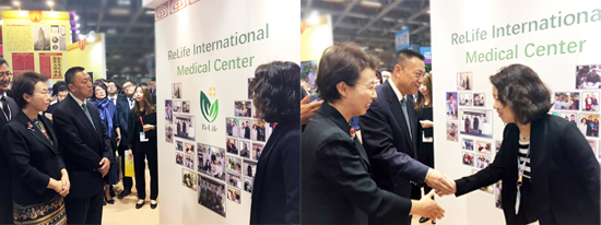程红副市长和澳门财政司长梁维特在北京市中医局副局长罗增刚陪同下在ReLife 国际医疗中心展位了解ReLife在用中医帮助国外患者摆脱病痛、中医推向国际方面做出的成绩。