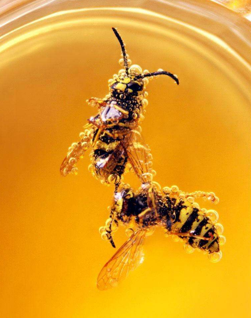 机器蜜蜂还必须能够再从水里出来。这比较棘手,因为水的表面张力——让水分子彼此靠拢的力量——会轻而易举地阻挡住只有一枚回形针大小的蜜蜂机器人。为了提供动力让它突破水面,研究人员为其加装了四个舷外浮体,这样就能让机器人漂浮在水面。他们还给蜜蜂机器人配备了一个中央电解板,它可以把水转化为氢氧。氢氧充当燃料,以将机器人从水里推向距离最近的陆地。
