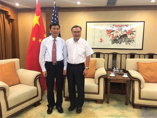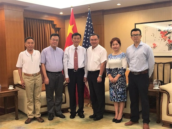 中国驻洛杉矶总领事张平(右3)、副总领事庄志哲(左2)及科技参赞吕先志(右1)会见世界中联副主席兼秘书长桑滨生(左3)