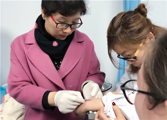 学员们临床见习蜂针、皮试、蜂蜡疗、蜂毒肽液无痛导入疗法、美容祛斑刺法
