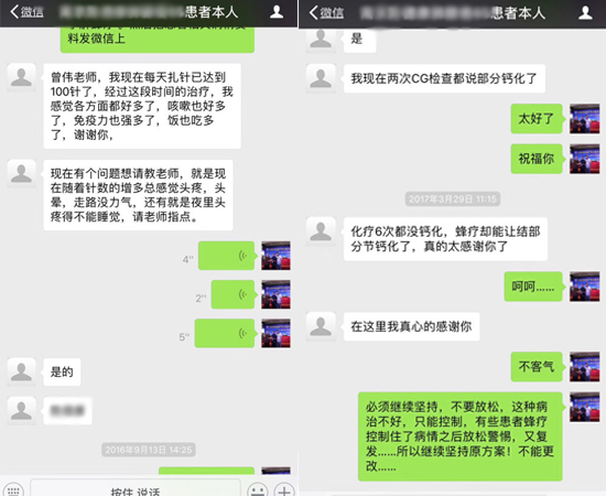 2017年3月29日,患者在微信上告知:肺部部分结节,化疗6次都未钙化,蜂疗后部分钙化了。