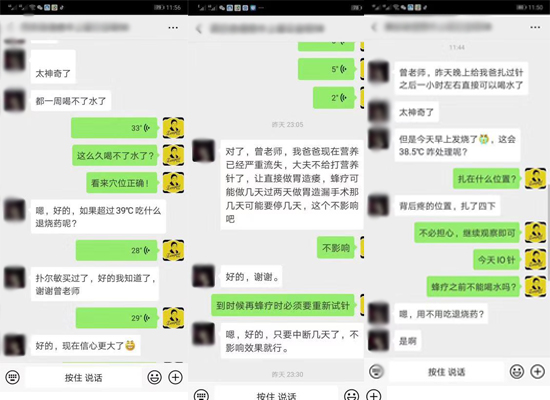 这次19年1月南京39蜂疗培训班上,来了一位西安的晚期食道癌患者的家属,患者因食道中上段梗死,放化疗效果不理想,1周以来连水都喝不下去,患者的主治医生无奈只好建议做胃造瘘手术,患者家属不忍心看到患者如此折磨,于是决心尝试蜂毒治疗,令人振奋的,短短一小时奇迹就发生了,试针后蜇疗4只蜜蜂,1小时后可以喝下水……家人惊叹,蜂疗太神奇了!