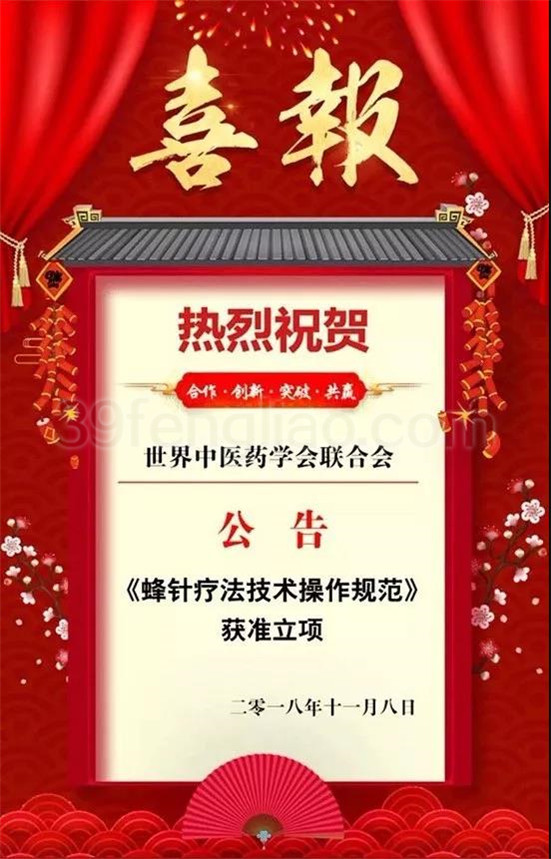 中医蜂疗这一千百年来留下的民间疗法,在2007年已正式纳入我国“中医诊疗科目”。这意味着国家对这项医学手段将大力推广并应用于临床,也将是以蜂蜇疗法为代表,拥有数千年历史的中华传统中医文化走向世界的里程碑。