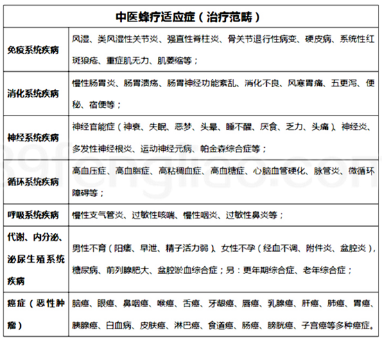 中医蜂疗对风湿、类风湿性关节炎、骨关节病、腰椎颈椎病、强直性脊椎炎、硬皮病、哮喘、神经痛、神经炎、心脏血管疾病及肿瘤等上百种疑难杂症均有着更确切的疗效。