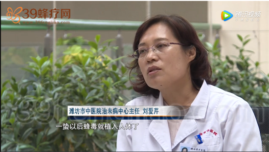 刘爱芹医师说道:针灸的穴位都可以蜂疗,所以有针的作用,一蛰以后蜂毒就植入人体了,蜂毒是一种蜂毒肽,进入人体之内,就相当于我们临床上的穴位注射,就进入穴位上了,再一个蜂疗做上以后,局部的感觉热、痛,有点痛的感觉,但是主要是热的感觉,所以还相当于艾灸的作用,效果比一般的效果还要好。