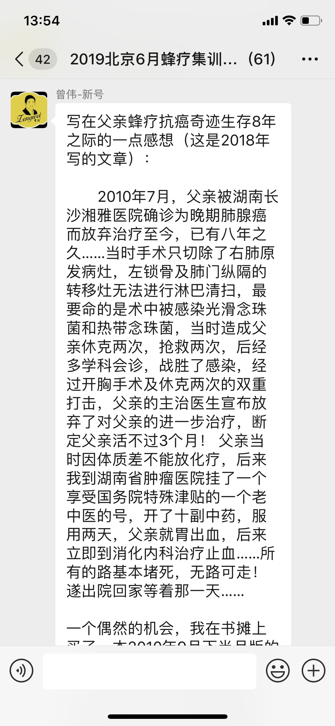 【39蜂疗网】记者 讯 39蜂疗网小编在(总第37期)2019年39蜂疗实战集训营6月份学员群内,获悉曾伟老师在给学员们分享父亲9年蜂疗抗癌历程...引起了众多医生学员的赞许!下面小编带着大家一起了解一下其究竟......
