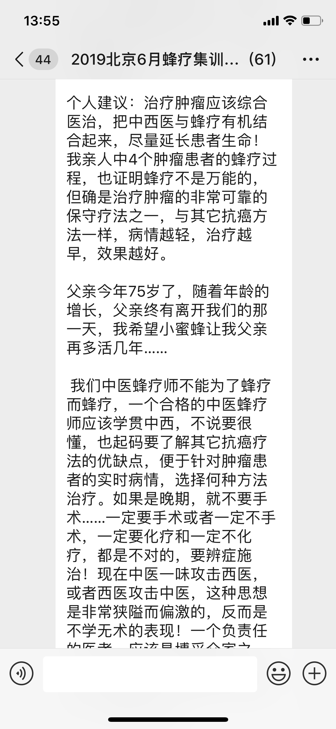 我们中医蜂疗师不能为了蜂疗而蜂疗,一个合格的中医蜂疗师应该学贯中西,不说要很懂,也起码要了解其它抗癌疗法的优缺点,便于针对肿瘤患者的实时病情,选择何种方法治疗。如果是晚期,就不要手术……一定要手术或者一定不手术,一定要化疗和一定不化疗,都是不对的,要辨症施治!现在中医一味攻击西医,或者西医攻击中医,这种思想是非常狭隘而偏激的,反而是不学无术的表现!一个负责任的医者,应该是博采众家之长、取其精华、祛其糟粕,合理综合运用各种手段解决肿瘤患者的实际问题……
