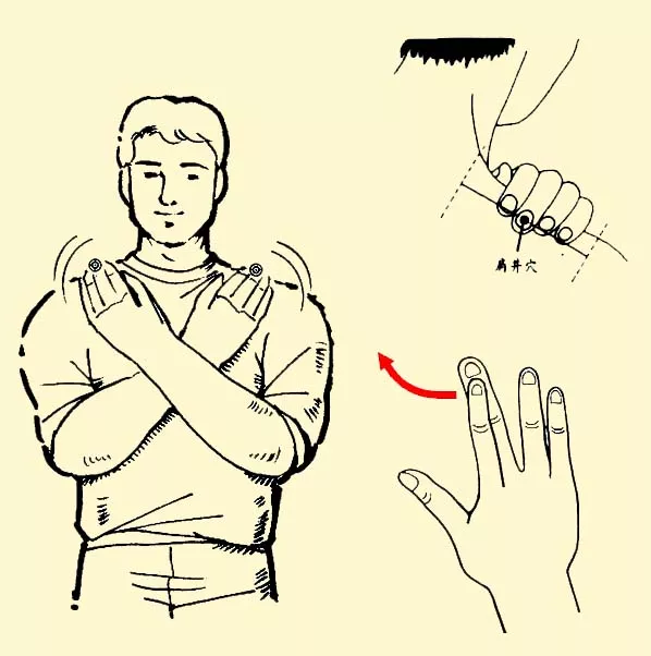 双手交抱,手掌搭在肩头,中间三个指头放在肩膀和颈部的交汇处,中指指腹处即为肩井穴。