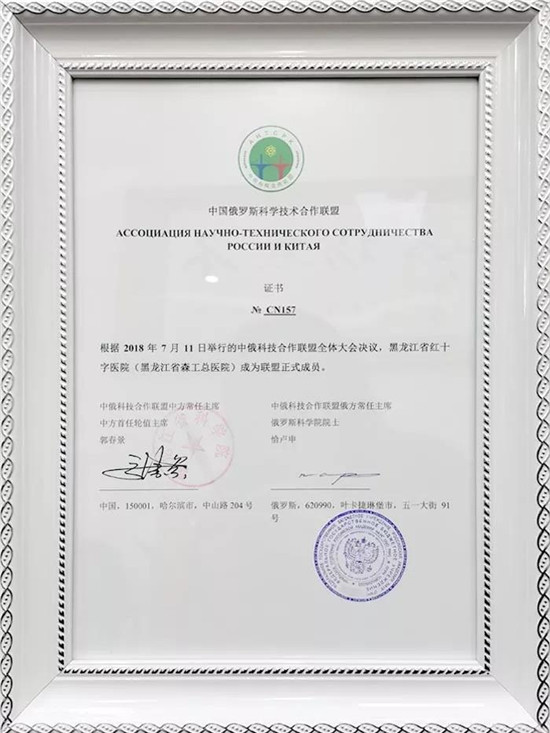 【39蜂疗网】记者 讯 来自黑龙江省红十字(森工总)医院的喜讯:近日,中俄科技合作联盟办公室给黑龙江省红十字(森工总)医院科教科寄来一份证书是关于正式批准该院为中俄科技合作联盟成员单位!