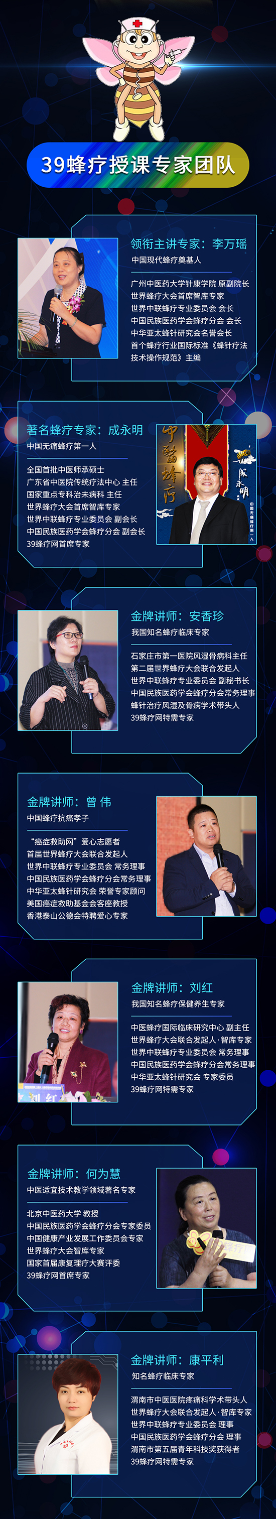 选择集训营,最重要的是品牌力量。39蜂疗集训营,领衔主讲人为我国著名蜂疗专家——李万瑶教授,世界首个达到国际标准的《蜂针疗法技术操作规范》就是在她的带领下完成的;同时多位国内知名蜂疗专家亲临授课,名师才能出高徒,这是39蜂疗集训营的底线。