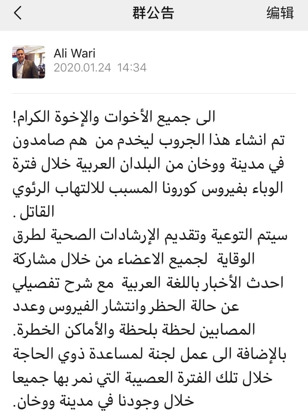 群主瓦阿里来自巴勒斯坦,目前就职于湖北天勤生物科技有限公司。他曾在中国主修学习胸外科专业,精通中文。瓦阿里说:“一开始建这个群是为了帮助阿拉伯朋友翻译关于新冠肺炎的信息,后来朋友带朋友就成了一个大群,目前人数在480人左右。”