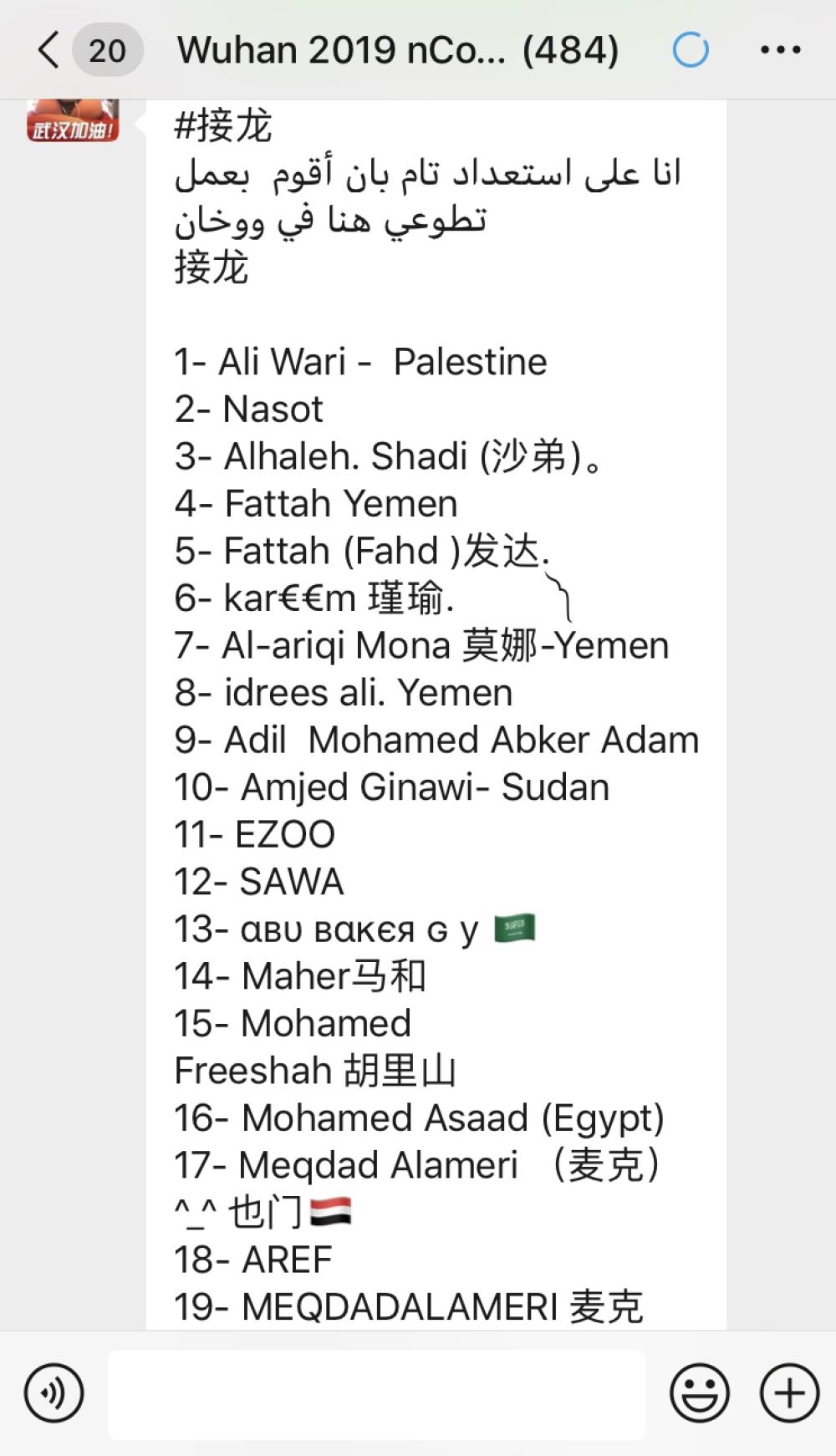 5日晚,瓦阿里在群里发起了一个报名“抗疫”志愿者的接龙活动,一天之内已经有30多位群友报名。同样来自巴勒斯坦的哈提卜说,他报名之前询问了家人,家人同意他的做法。他说,抗击疫情一定有科学有效的解决方案,只是需要时间。