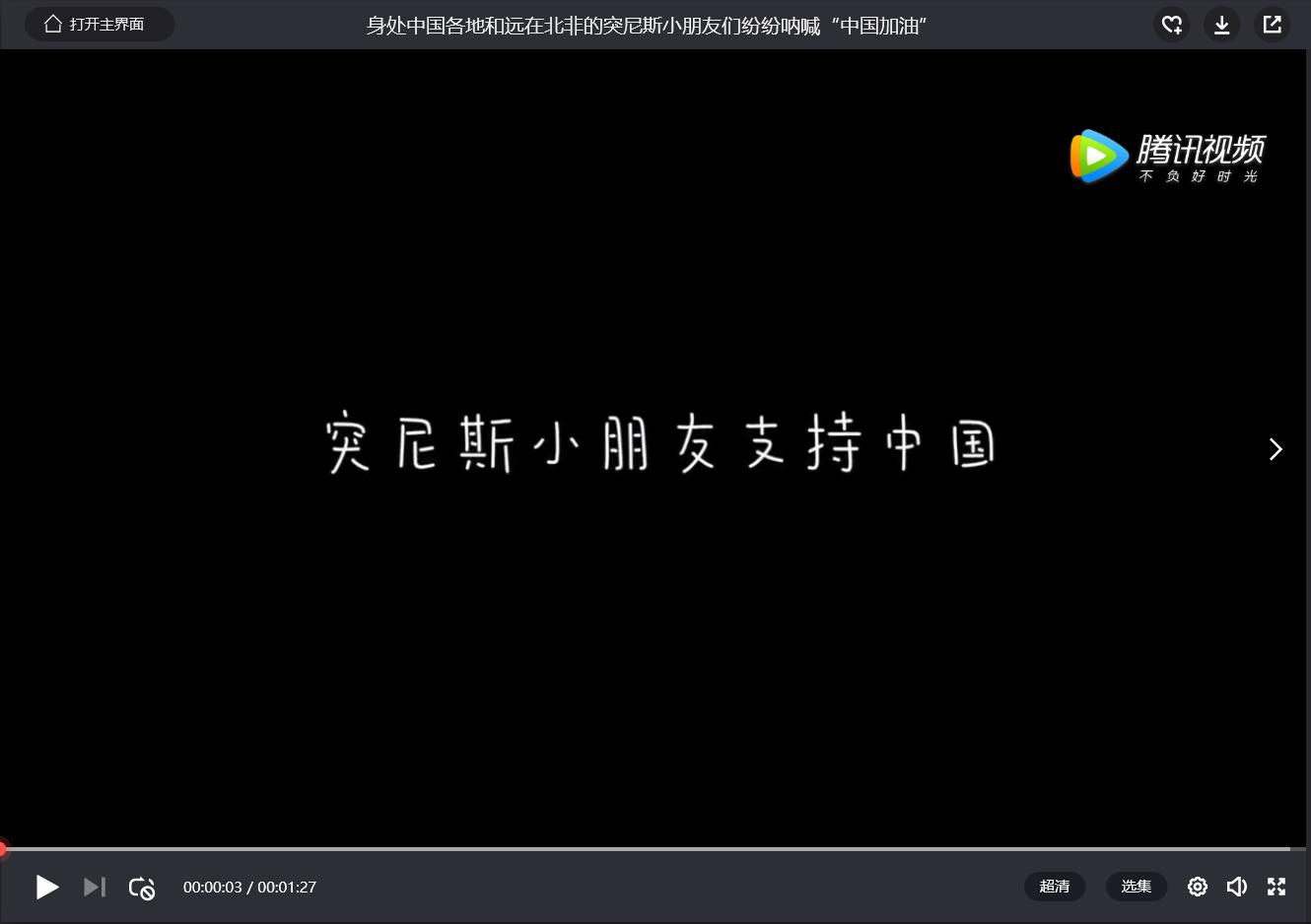 新冠肺炎疫情暴发以来,阿拉伯国家以各种形式表达对中国的支持。在突尼斯人文思女士的倡议下,身处中国各地和远在北非的突尼斯小朋友们纷纷呐喊“中国加油,武汉加油”“我爱中国,我爱武汉”。(视频由文思女士提供)